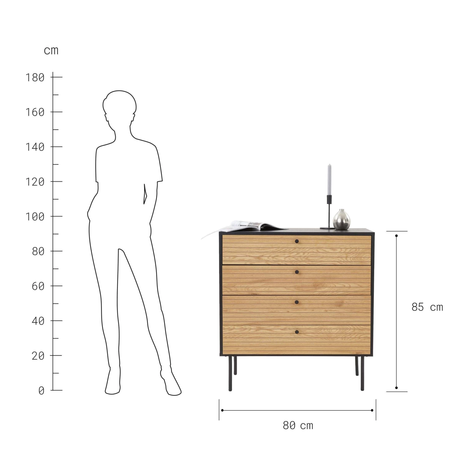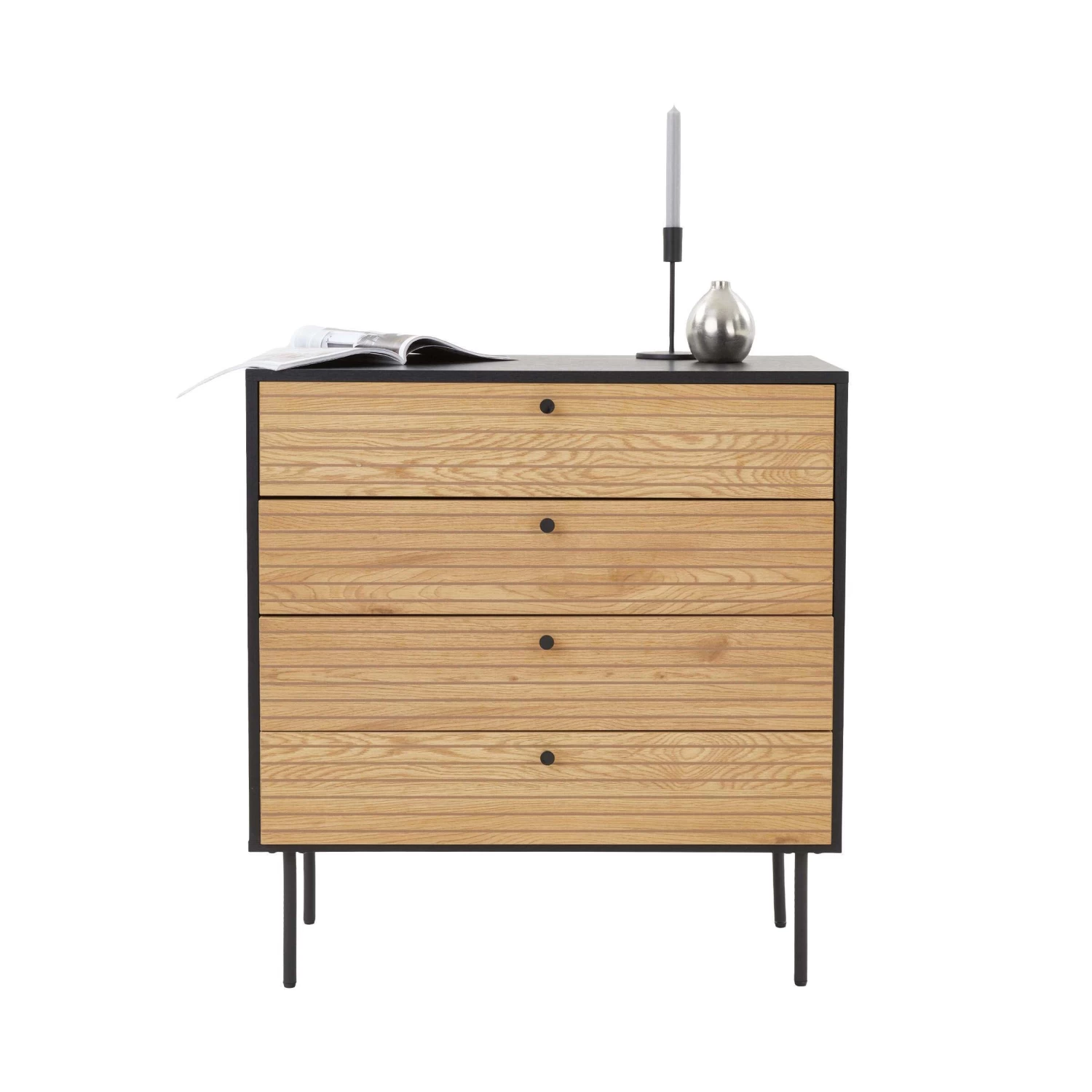 Eine Kommode ist eine Kommode ist eine Kommode? Nein, mit dem Einheitslook macht die Modernist Kommode definitiv Schluss. Das moderne Möbelstück kombiniert naturfarbenes Eichenfurnier mit MDF und Metall in Schwarz – bei geradliniger Formensprache und dezenten Füßen, die optisch für Leichtigkeit sorgen. Die hochwertige Ausfertigung fällt hingegen buchstäblich ins Gewicht: Schwer und massiv ist die Modernist Kommode solide und stabil aufgestellt, z.B. im Flur, im Schlafzimmer oder im Gästezimmer.